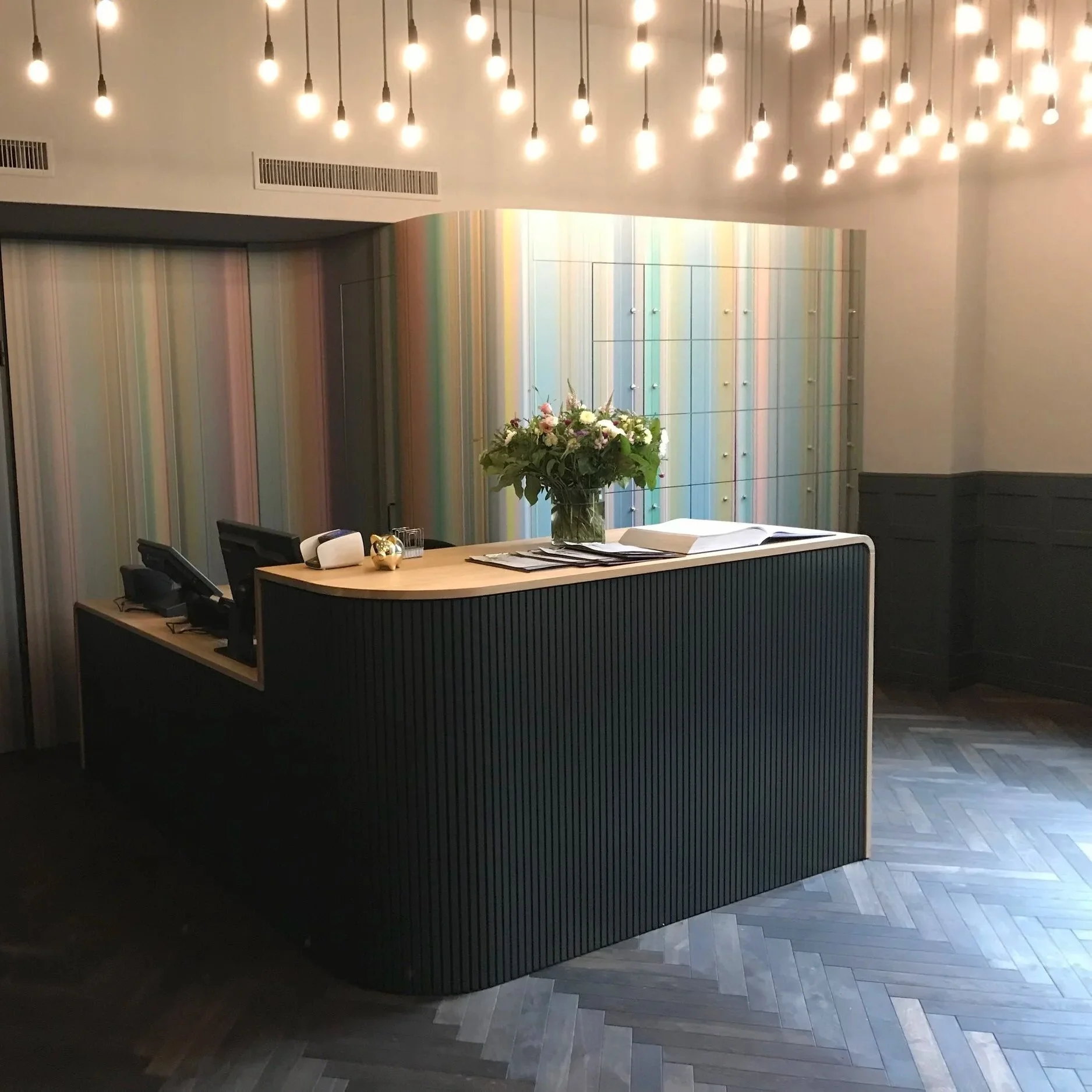 Wir durften in Zusammenarbeit mit der Andrin Schweizer Company den Empfangskorpus aus Eiche mit geschlitzter Front machen und dazu die Schliessfachwand sowie die Konstruktion für die Deckenbeleuchtung.