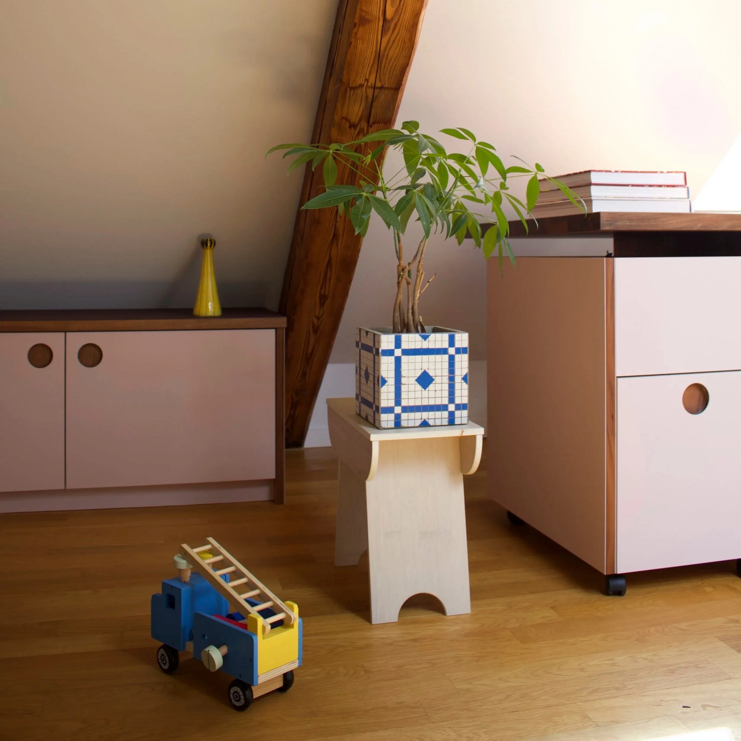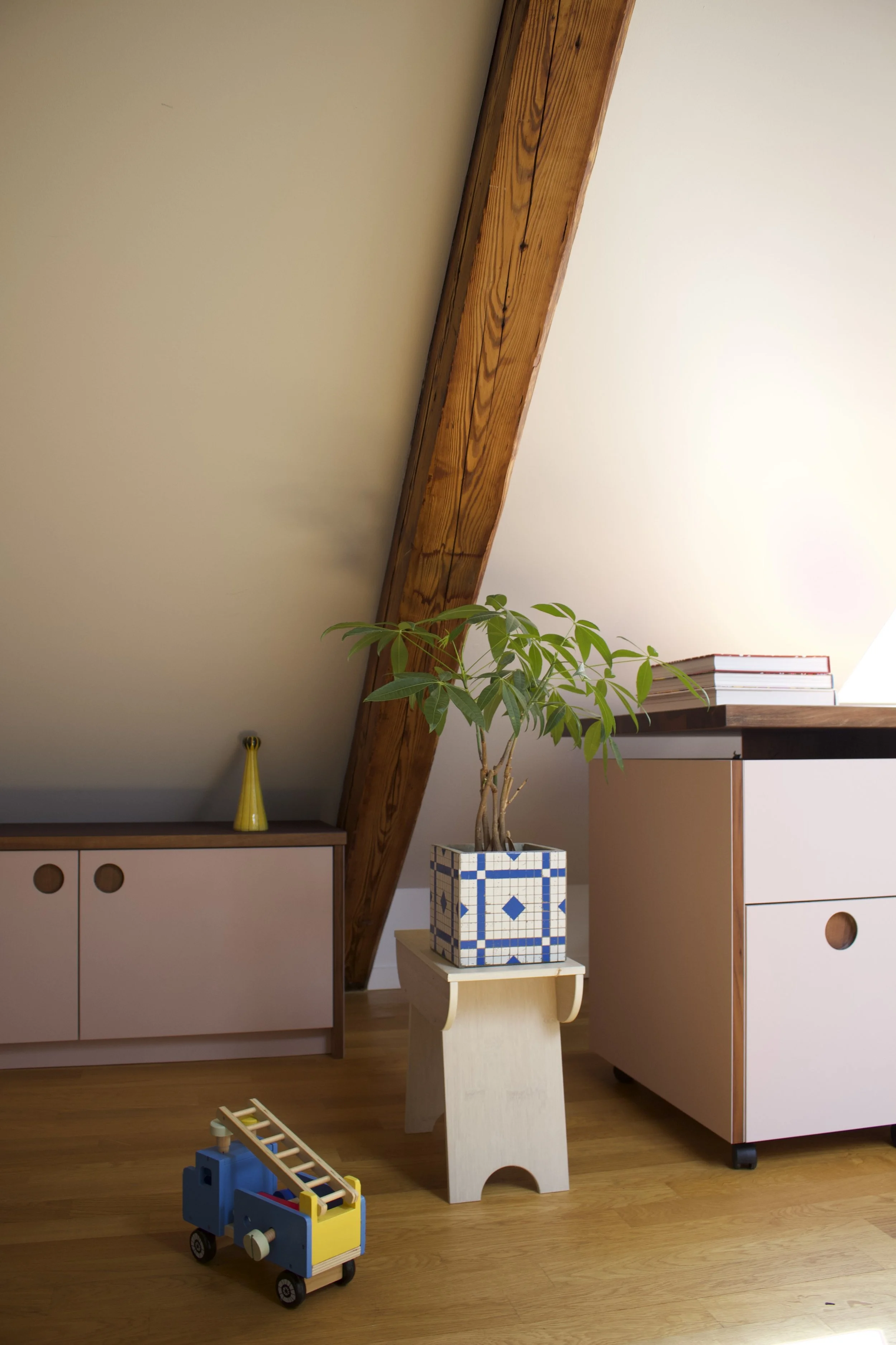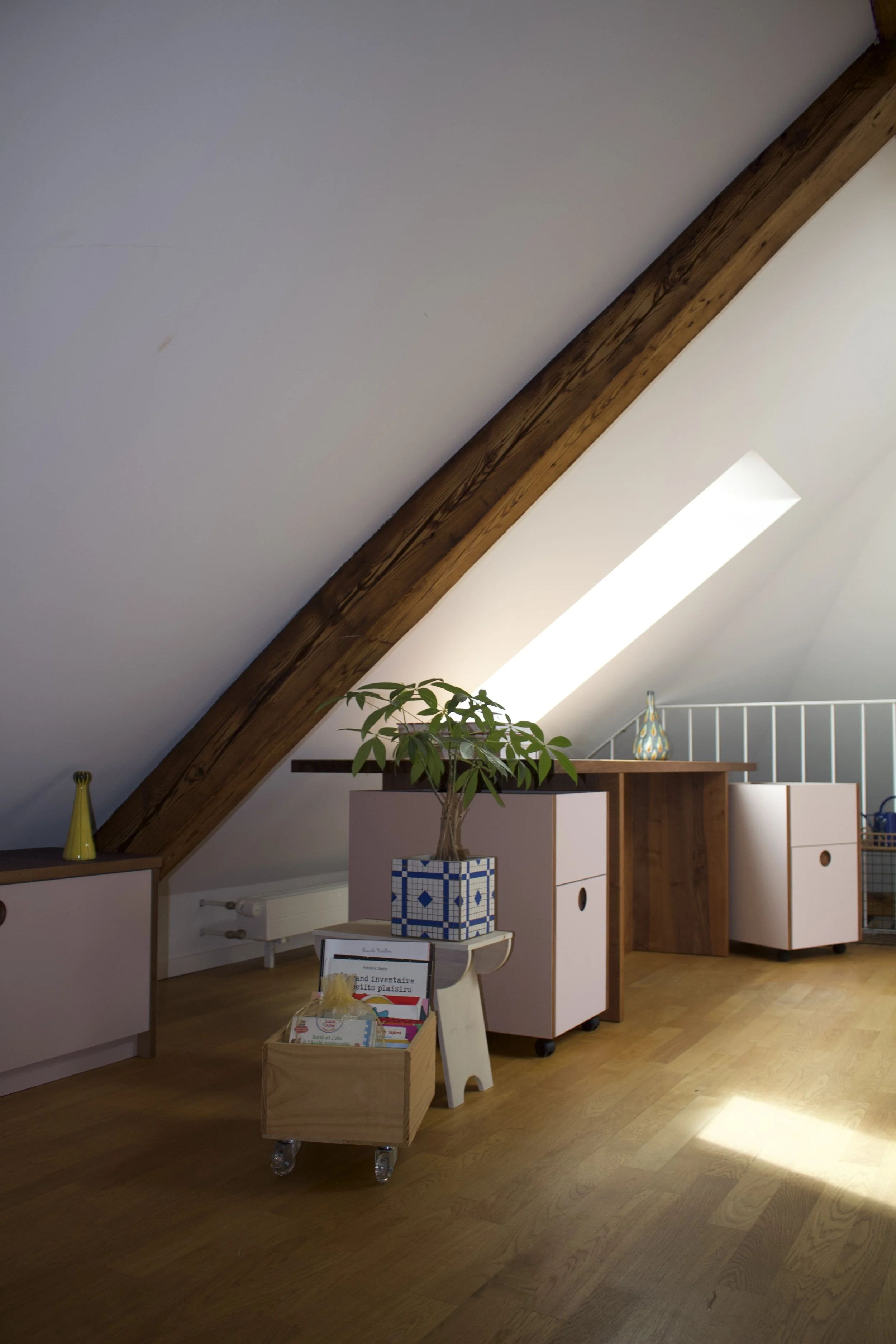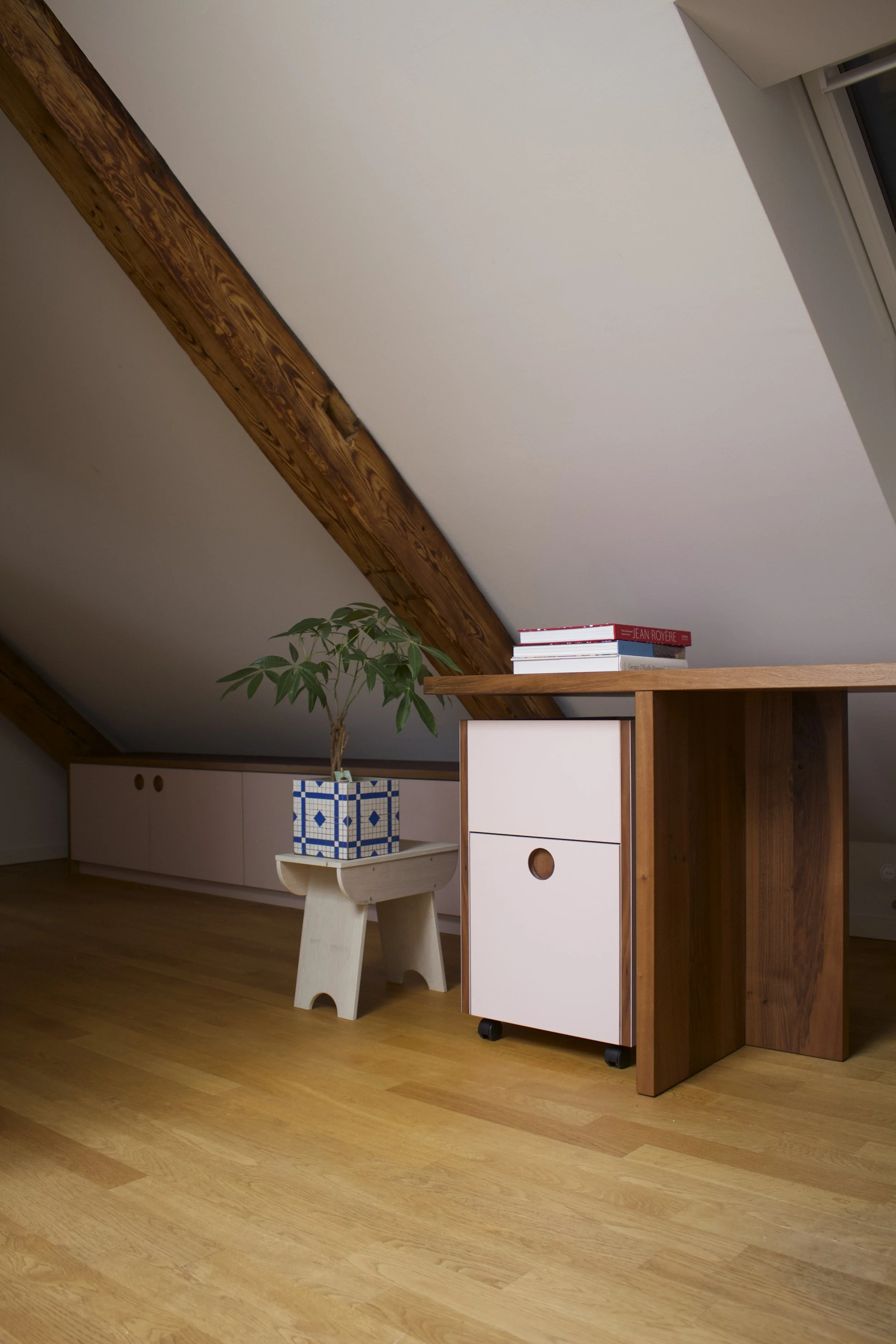 In der Dachwohnung vis-à-vis unserer Werkstatt haben wir Einbaumöbel, nach den Plänen von Clara Jacazio, in die Dachschräge eingebaut.